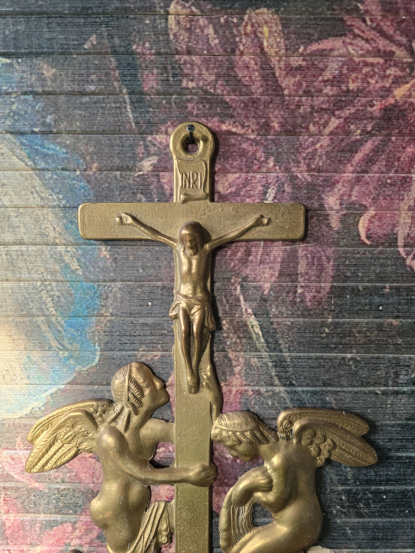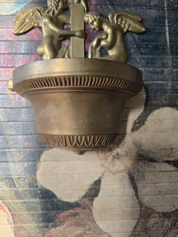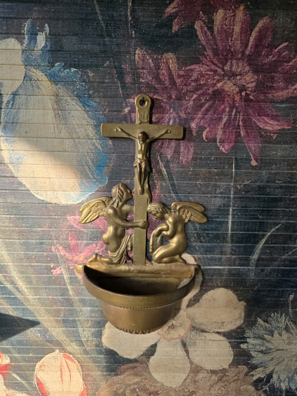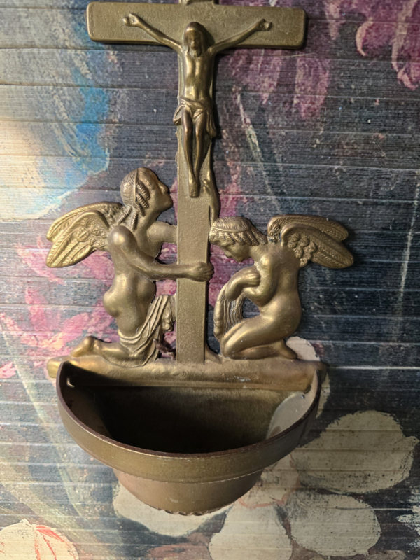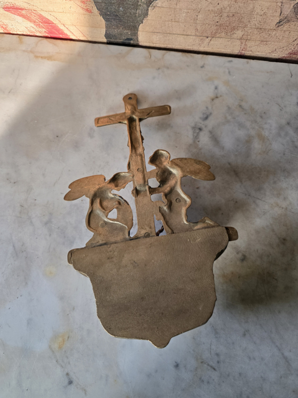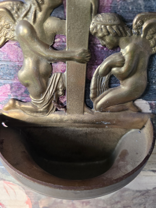 Antiek messing wijwaterbakje engelen kruisbeeld